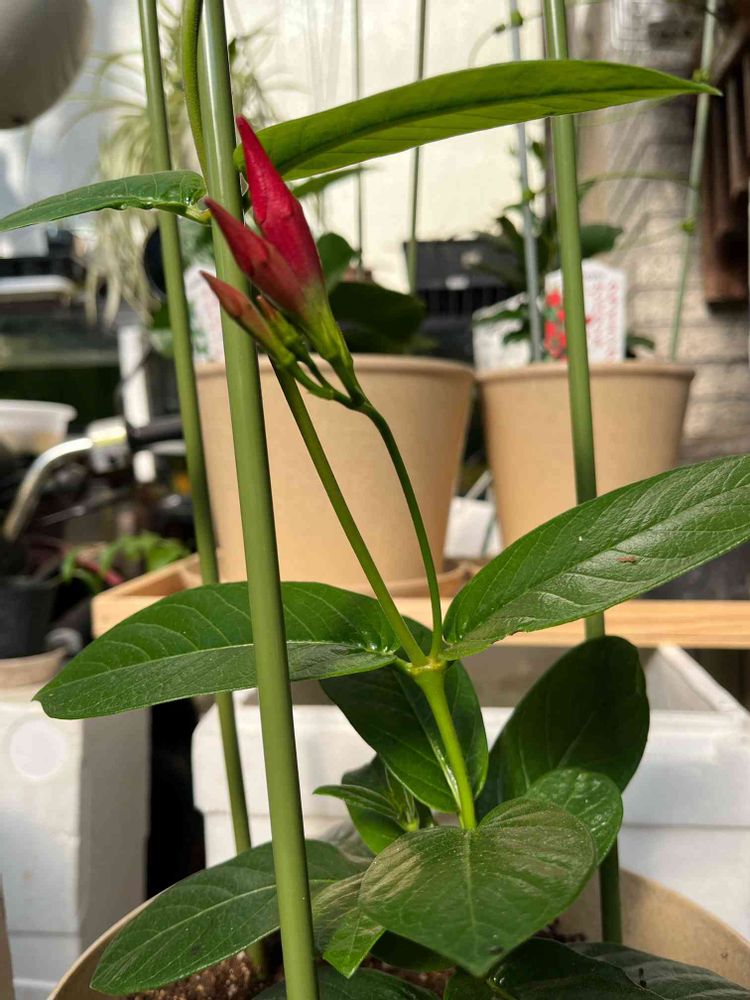 クライミングサンパラソル、自宅に届いて25日目、大輪系のレッドのツルは約70cmに伸びて蕾が😃