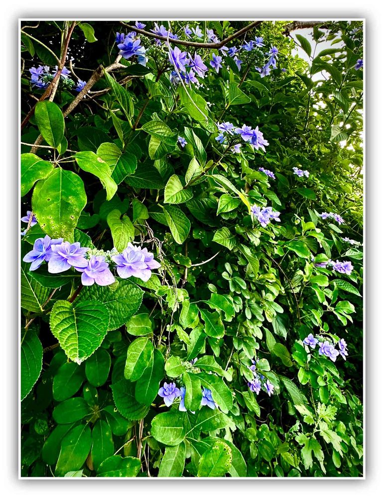 📝万葉の中庭の栴檀の木の下の土手沿いに開花している薄い青紫色のアジサイの花華たちデス🐶