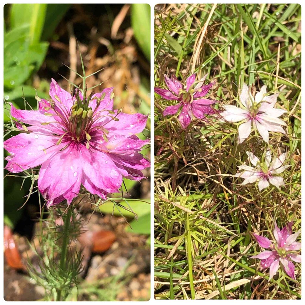 去年実家に種まきしたのは白いニゲラだったのですが、今年零れ種で咲いたのは綺麗なピンク←と、とっても小さくて背も低い1cmくらいの色が混ざっている赤ちゃんニゲラでした→。