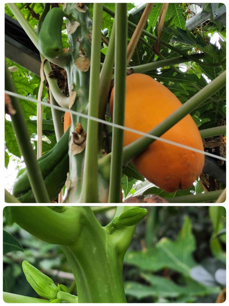 高いところにパパイヤの青い実と熟した実がなっていました。