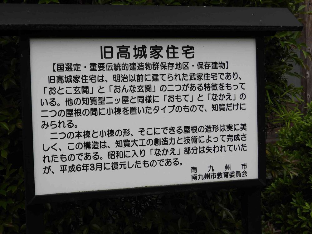 旧高城家住宅は、 明治以前に建てられた武家住宅であり、 「おとこ玄関」と「おんな玄関」の二つがある特徴をもって いる。他の知覧型ニッ屋と同様に 「おもて」 と 「なかえ」の 二つの屋根の間に小棟を置いたタイプのもので、 知覧だけに みられる。