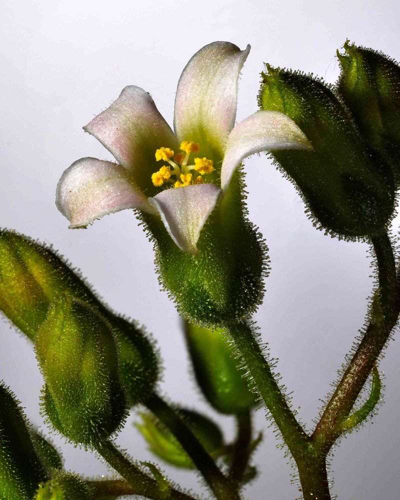 チレコドン・レウコスリクスに花が咲きました。チレコドンの例に漏れず小さな地味花ですが、萼が毛深いのが特徴的です。