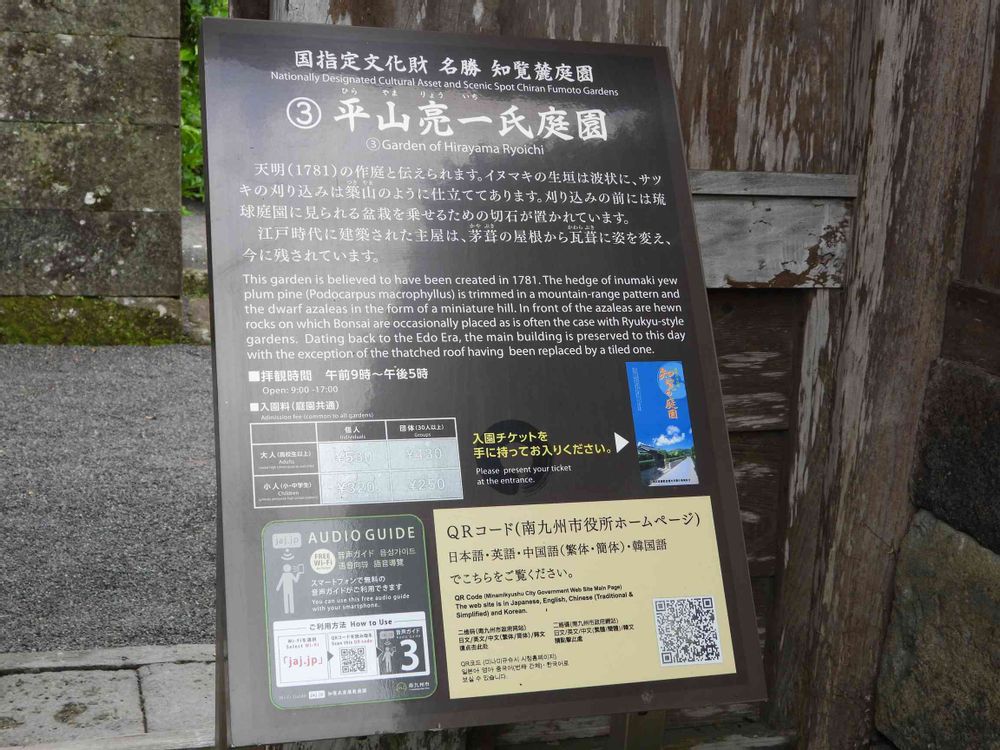 天明 (1781) の作庭と伝えられます。 イヌマキの生垣は波状に、サッ キの刈り込みは築山のように仕立ててあります。 刈り込みの前には琉 球庭園に見られる盆栽を乗せるための切石が置かれています。 江戸時代に建築された主屋は、 茅葺の屋根から瓦葺に姿を変え、今に残されています。