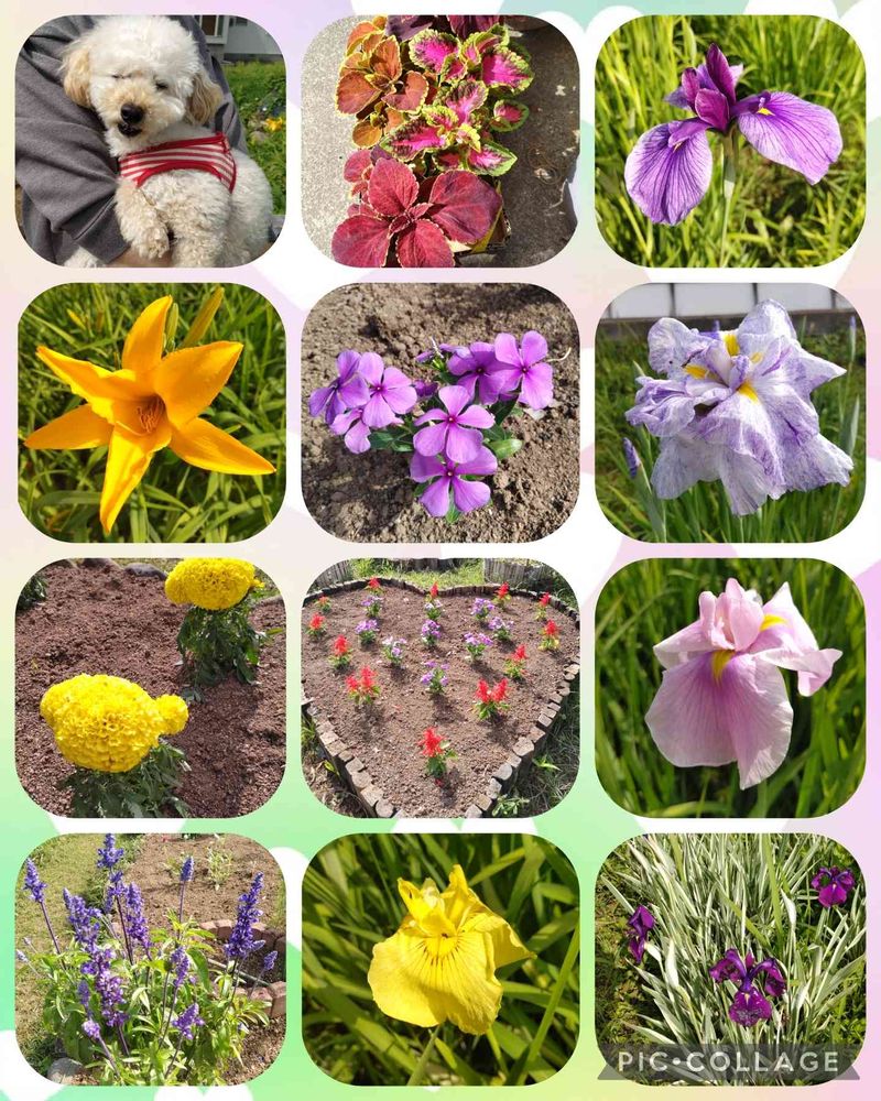おはようございます🌞今朝のお多福ガ―デンです。花菖蒲も、少しづつ花色が咲きだしてます。ハ―ト形の所も、日々草、赤のサルビアで模様替えしてます。また、コリウスは、まだデビュー前です😉。🐩昨日近所のカエルくんが散歩中、花壇に立ち寄りました🤗花と、ワンちゃんです🌿🌻🌿🌿🌿🥰