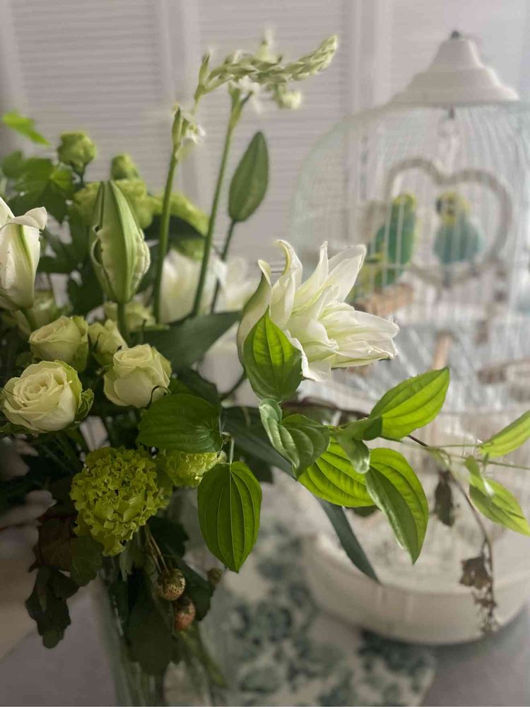 昨日のフラワーアレンジメントのユリが開花し始めました\(//∇//)\百合の白が目立ってくると…筋の綺麗な緑の葉っぱの利休草が良いお仕事をしてきています╰(*´︶`*)╯♡