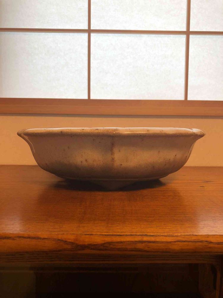 松泉焼 山秋造り 白釉輪花鉢。