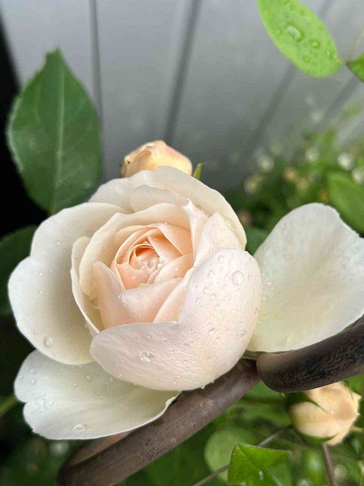可憐で棘が少なく、挿し木もつきやすいので良い薔薇だと思うのですが今年はどうも花が俯いてしまいます。茎が細くて花が大きいからのようです。