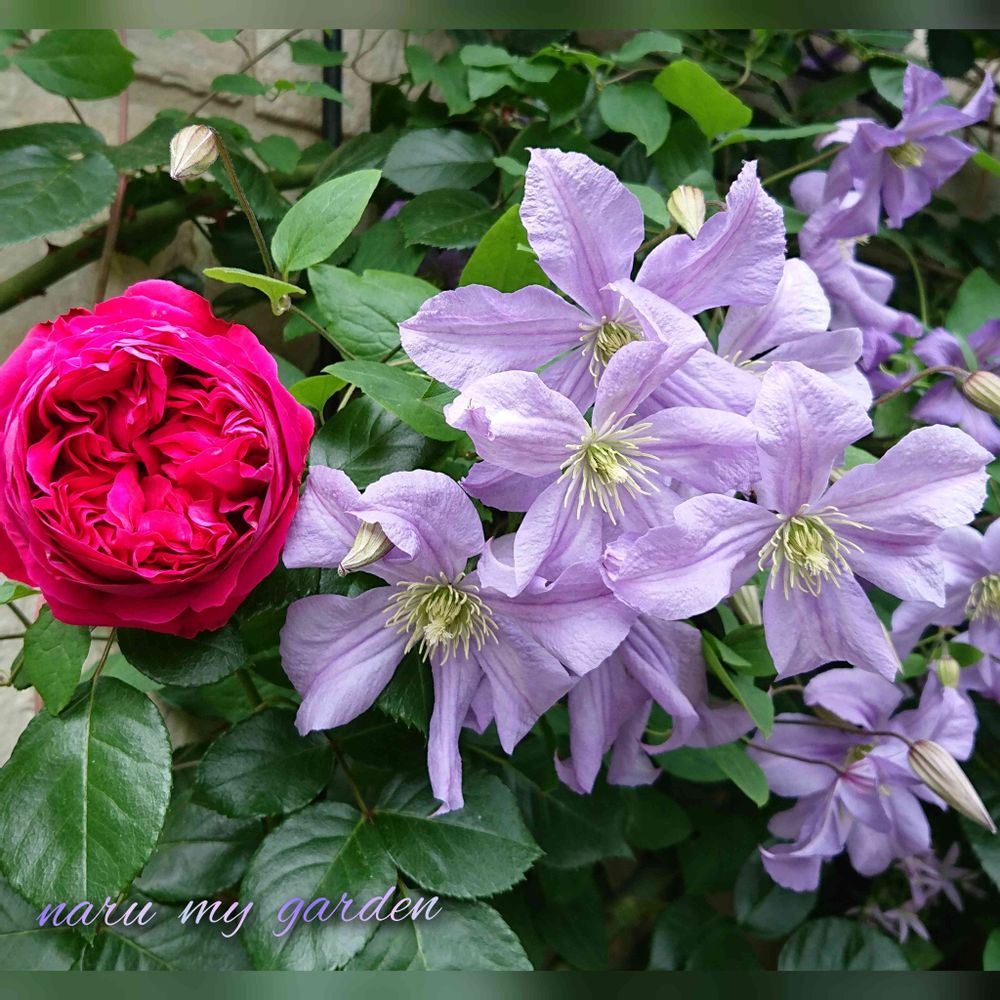 今年もたくさん咲いてくれたクレマチスのプリンスチャールズ💜とルージュ・ピエール・ドォ・ロンサールとのコラボです🌹💜