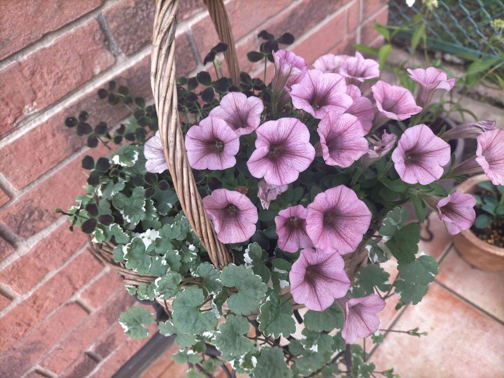 こんばんは😃かわいいかご?に入ったべヂュニアと、緑の葉の組み合わせが素敵ですね~💕センスがいいです💕✨✨
