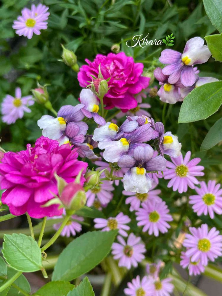 ミニバラ スイートチャリオットと繰り返し良く咲くプラキカムとネメシア達は 小さな花同士で寄り添ってて可愛いです ✻*˸ꕤ*˸*⋆。ꕤ︎︎·͜· ︎︎