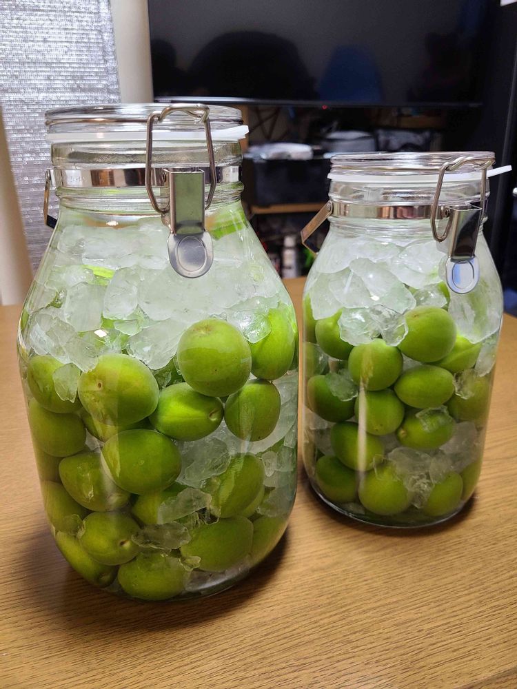 400gの梅の実が残っていて、冷凍してから梅酒作ります。これだと早く飲めるみたい😳....とっ、10粒自家製梅の実があるので明日もいで冷凍して