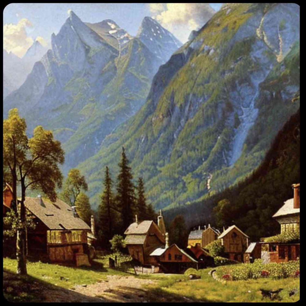 10K,高品質,写実的,油絵, 風景画 , リアル, 絶景, ヨーロッパで最も写真に撮られた場所”とも呼ばれる湖畔の街, 16世紀に建てられたアルプスの家々, ハルシュタット,オーストリア, イワン・クラムスコイ