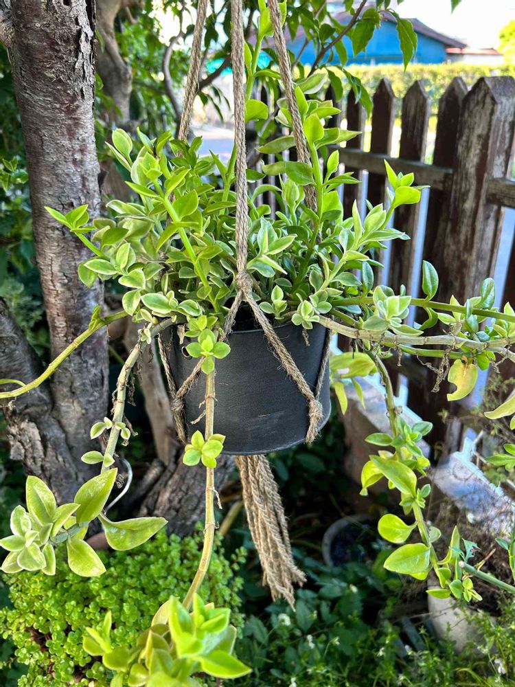 蚊取り線香の缶を黒く塗ったハンギング鉢。ベビーサンローズを植えてみた。花が咲いたら…きっと可愛いはず💕