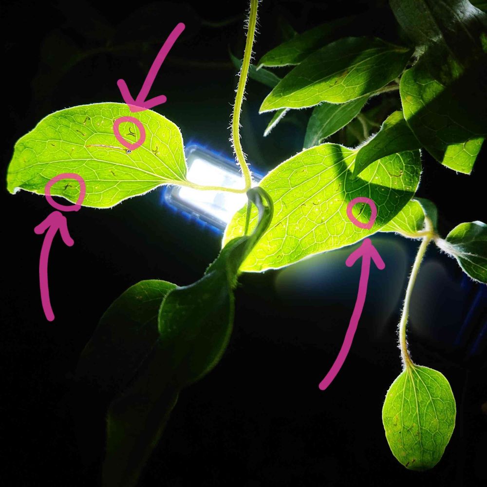 先ほど「ハモグリバエかも」という記事を見て、慌てて葉の裏側から光を当ててビックリ!!