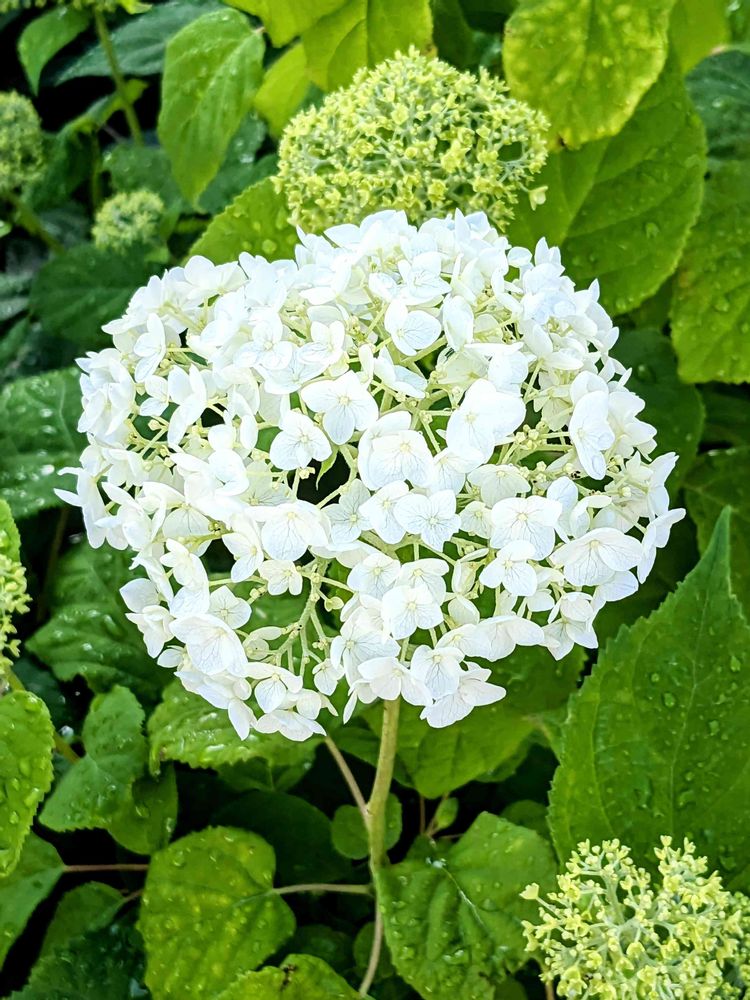 初めは普通にシロ紫陽花と思ったのですが、茎が細めで「アメリカアジサイ」「西洋アジサイ」と呼ばれるアナベルと確認出来ました。