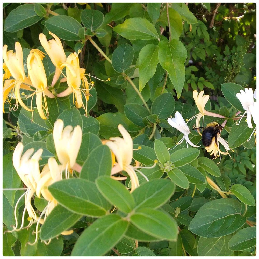 わが家のスイカズラにも、同じ蜂はち🐝がきてました。マルバナバチってお名前だったのね👍