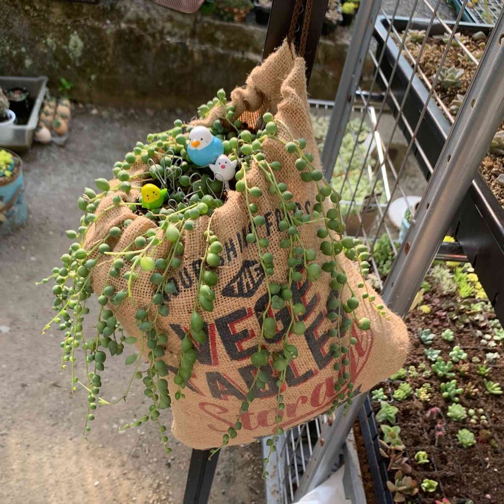 伸びて来たグリーンネックレスをカットして、吊り鉢の代わりに、麻袋に植えてみました。