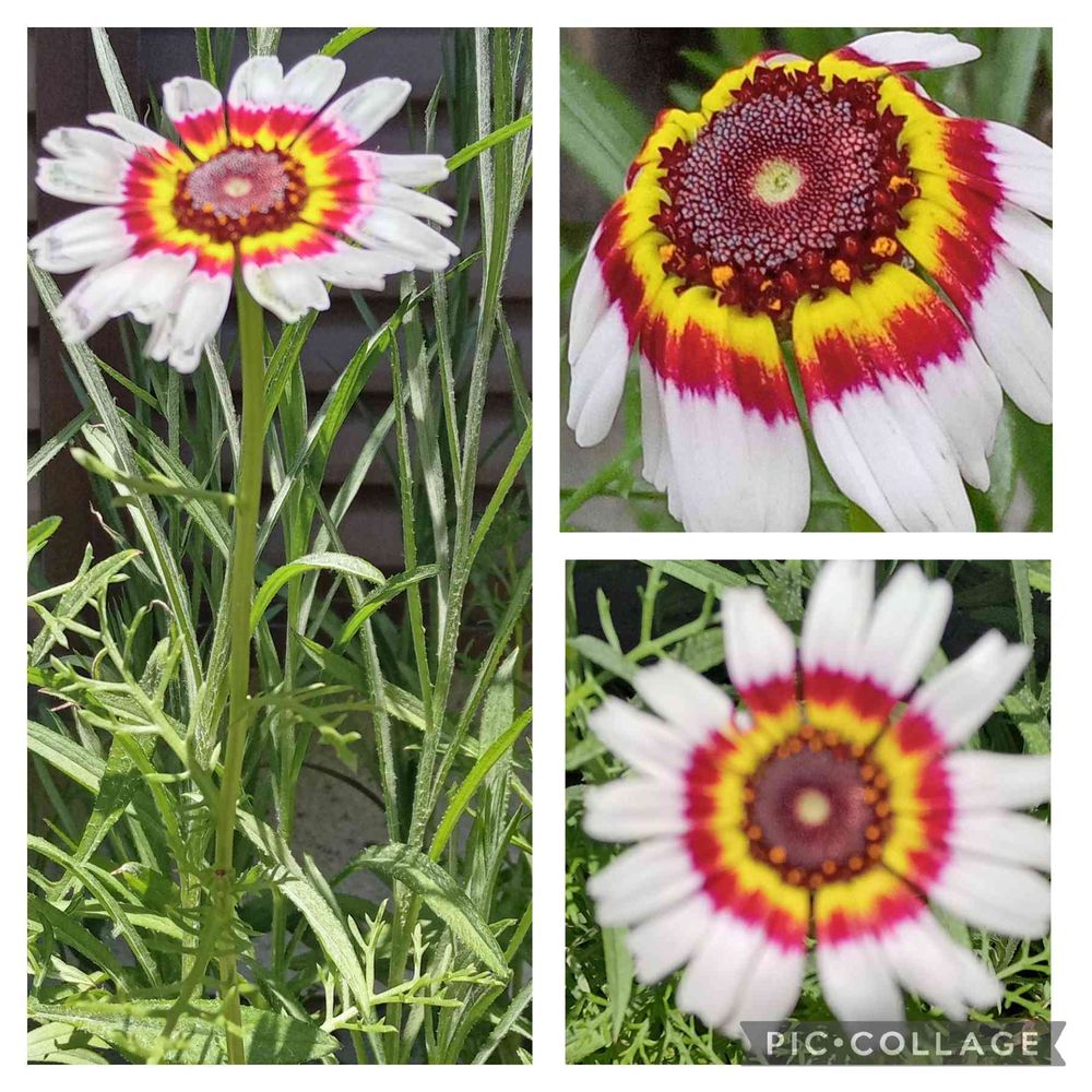 ミックスフラワーの種の中から、こんな花が咲きました。咲いたのは、ほぼヤグルマギクばかりでしたが、やっと別の花が咲きました。右上は、朝の花の状態。白い花びらが外向きに反り返り下向きに垂れ下がっています。午後陽が当たると、花びらがだんだん持ち上がり右下のように、ぴんと真横に広がっていました。