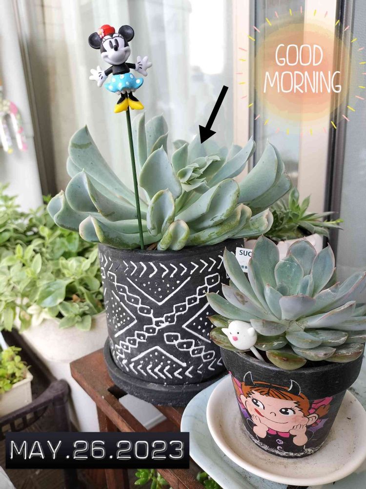 以前ミルさんから頂いたトップスプレンダー🌵がこんなに大きく成長して大きめの鉢に植替えたら👀✨直径18cm程になり、何やら横から🌱のような物が出てきました💞🧐