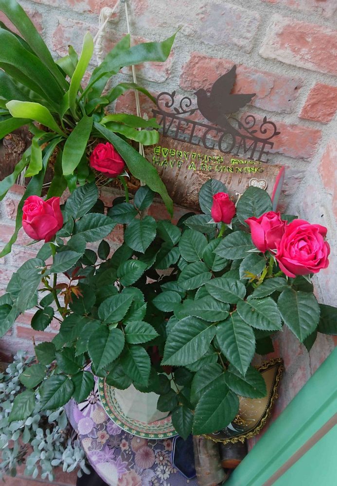 玄関口のインターフォン真下にお住まいの鉢で楽しめるガーデンローズの真っ赤な薔薇(///∇///)👏🌹