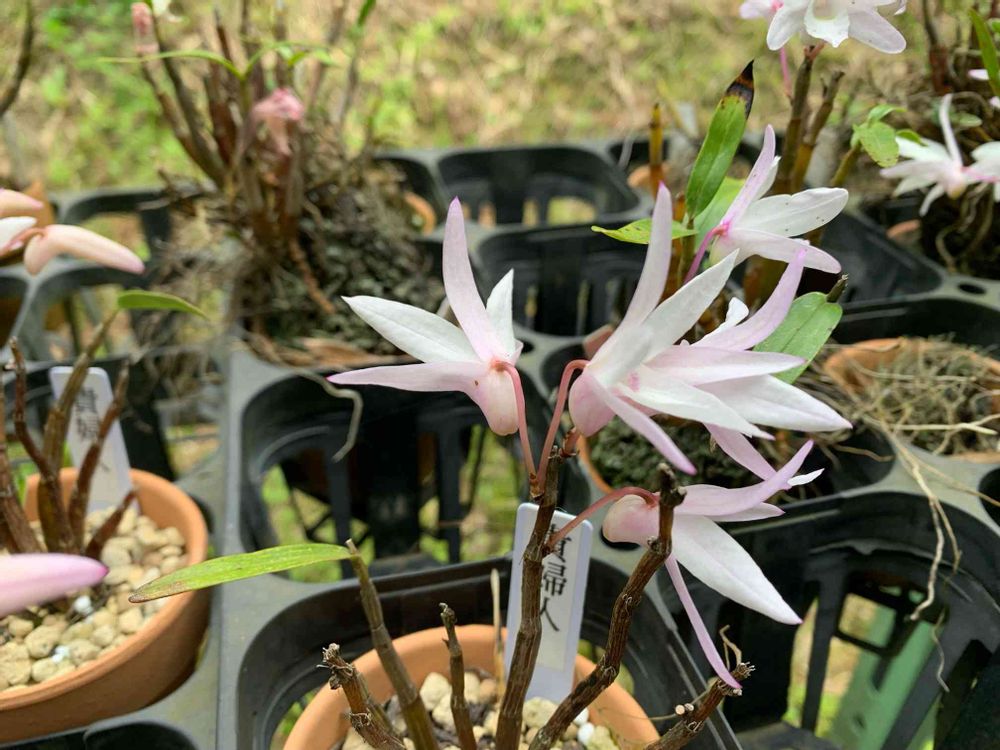 セッコクの貴婦人も咲いてきました😀これは今年ミズゴケから砂植えに変更したものです😀