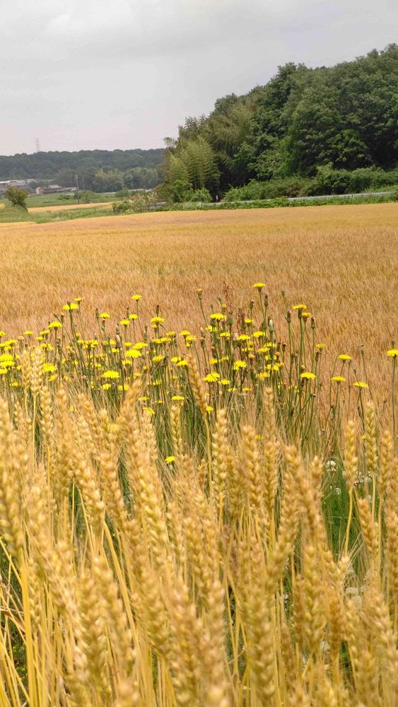 畦道のブタナを挟んで、一帯は麦の収穫時期を迎えている❇️ 麦が熟する頃に降る雨を麦雨という☂️ 梅雨に入る前に収穫をしてしまう金曜キラキラ🏷️