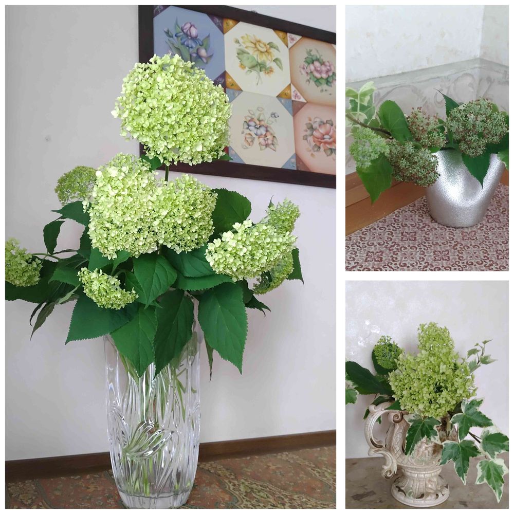 前のお宅にとび出してる花をカットして、とりあえず飾ってみました!アナベルは茎が細いので、水あげするか、不安😅だめだったら花手水にしようかな!
