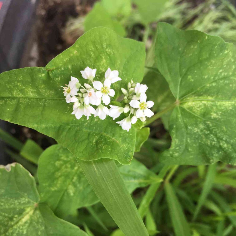 インコ達の残り物を撒いてるプランターから蕎麦の花が咲きました。