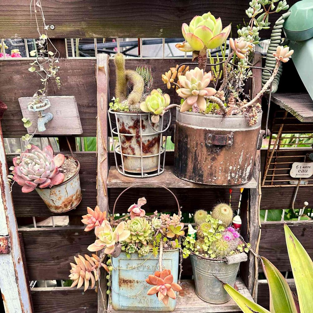 暴れまくりの寄せ植え達。シンバラリア迄勝手に植わっちゃって花まで咲かせてサボテンの花冠と合ってる❣️