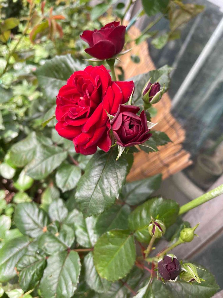 5/26 深紅のバラ「いっちょう」(鉢の名前)💕11日upの右側の房咲きたちです😍