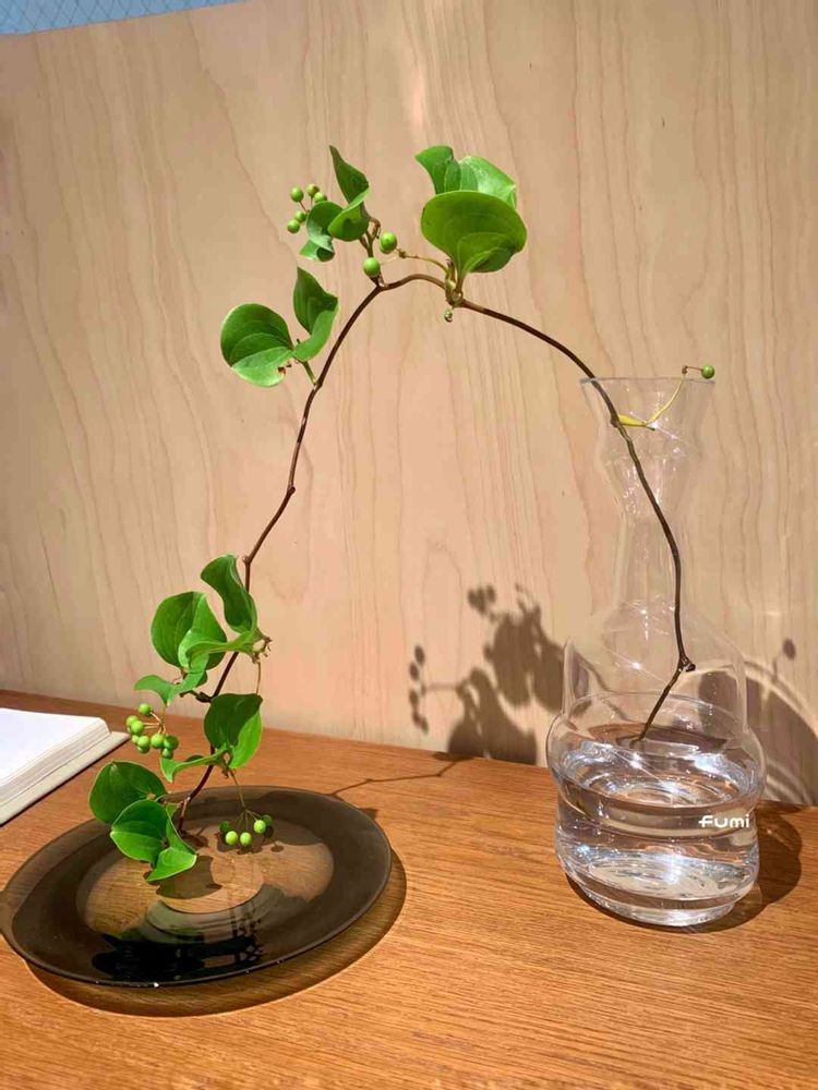 素敵なガラスのベースに、なんとも絶妙なバランスで生けられていた山帰来