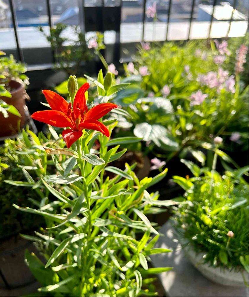 直径4cmほどの小さな花をつけるヒメユリは、開花球根を入手してから数年、野草の寄せ植えの中に咲く赤い花を夢見ていたけど果たせず、秋に救出して駄温鉢に単植したらアッサリ開花❣️