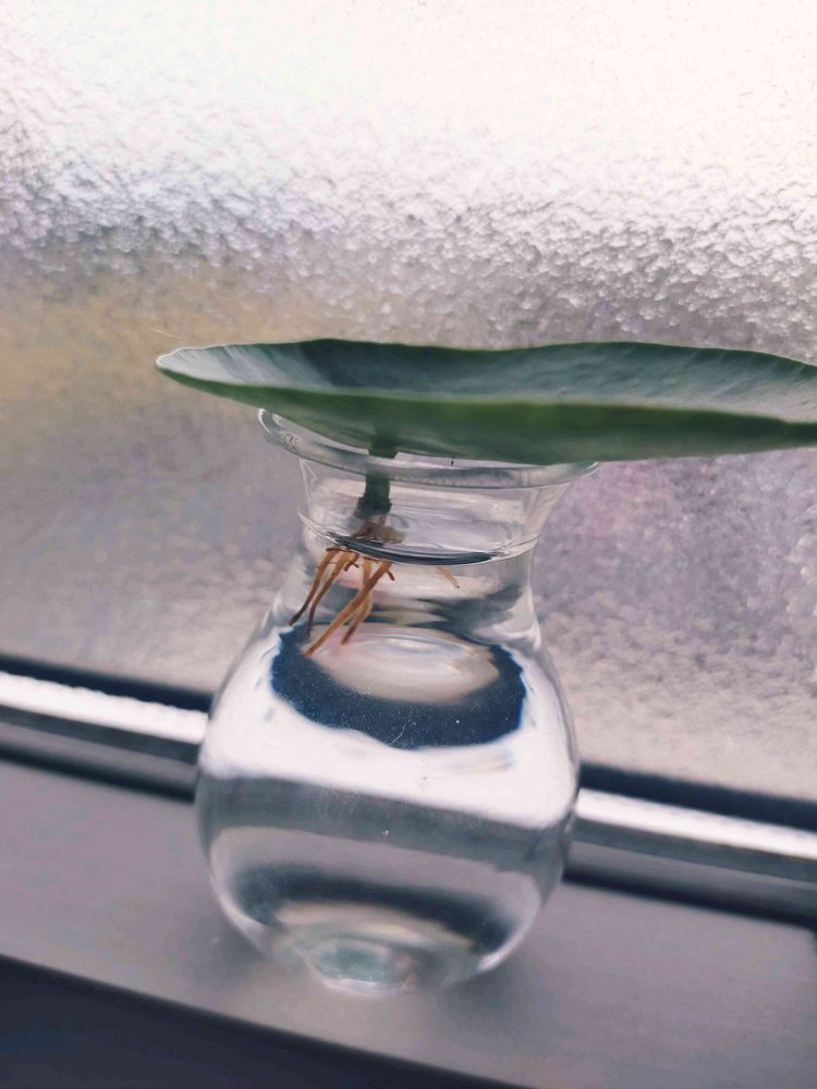 ペペロミアの葉が折れたので水に挿してたら根が出てきた( ºロº)