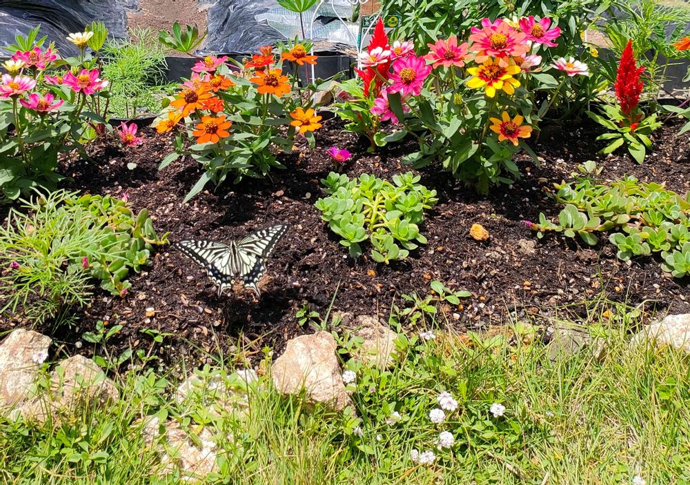 ジニアとポーチュラカの花壇でアゲハ蝶がくつろぎ中。