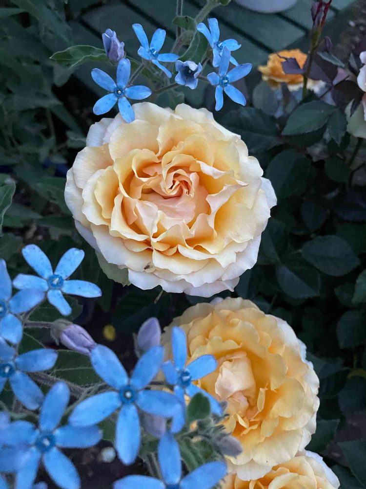 薔薇は花径8㎝はありミニ薔薇に見えません^ ^3年目の今年やっと本領発揮で綺麗な花を咲かせてくれています。濃いオレンジで咲き始め、淡い黄色に変化しますが、色があせても傷みが出ず花持ちが良いてす。