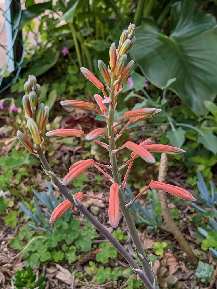 庭の花壇の片隅でイキイキと咲き誇る多肉の可愛い〜花🧡綾 錦(アロエ属)🧡