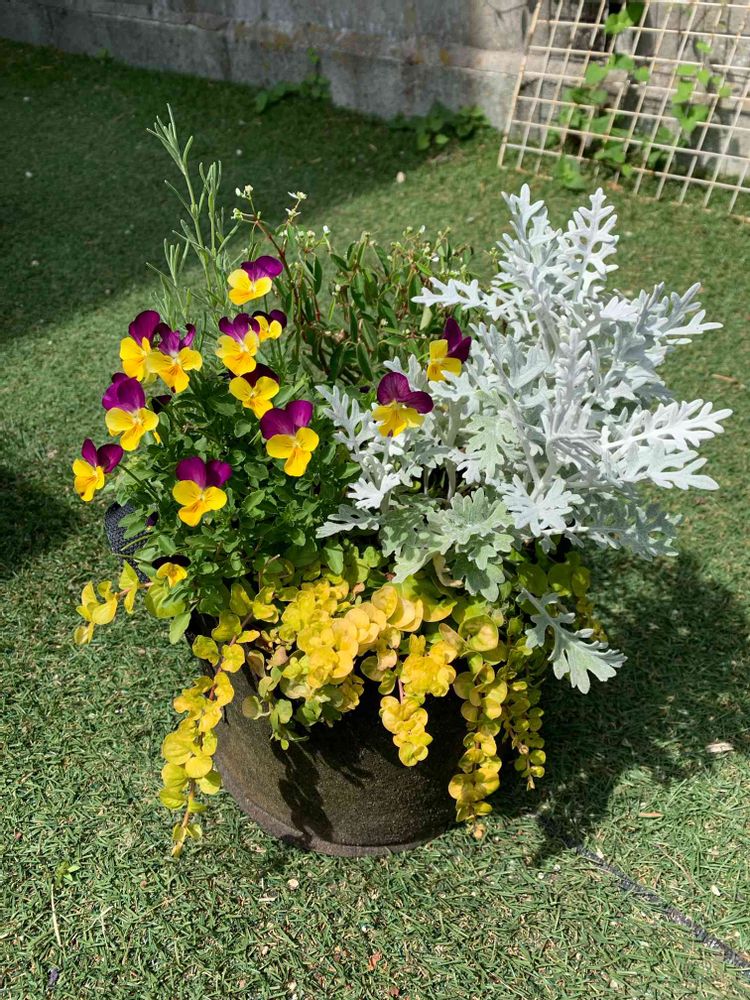 今日はビオラをたくさん片付けました。冬の間たくさん咲いてくれてありがとう😊この子はまだきれいに咲いていたので残しました。もう一株ビオラが入っていたのですが、そちらはみすぼらしかったので、さよならして冬越ししたユーフォルビアダイヤモンドフロストを入れました。いい感じに寄せることができました♪