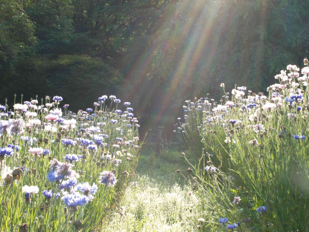 手こずったと書かれていますが、朝陽🌄の入り込みと矢車草がとても素敵です。