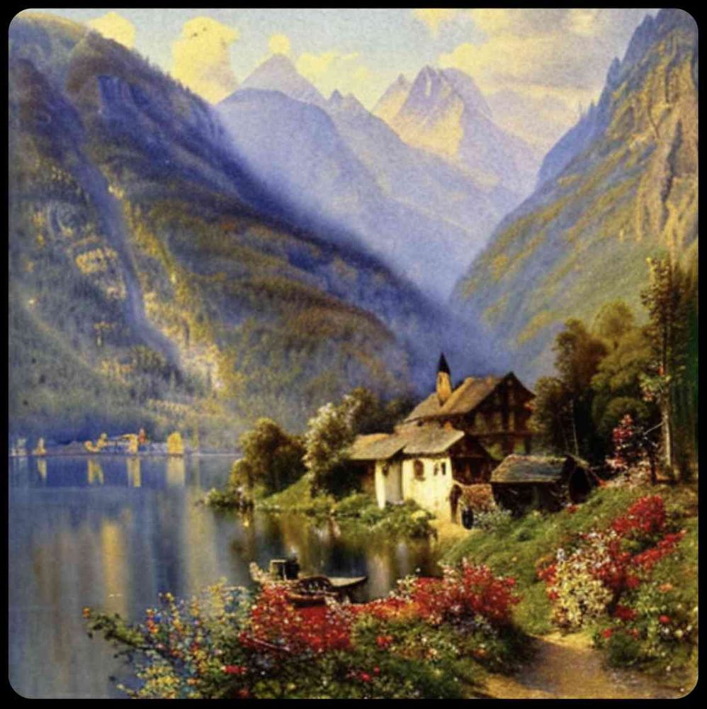 高解像度, 透明水彩, 緻密で美しい水, 超細密, 幽玄的, 一番最初, 10K,高品質,写実的,油絵, 風景画 , リアル, 絶景, ヨーロッパで最も写真に撮られた場所”とも呼ばれる湖畔の街, 16世紀に建てられたアルプスの家々, ハルシュタット,オーストリア, イワン・クラムスコイ