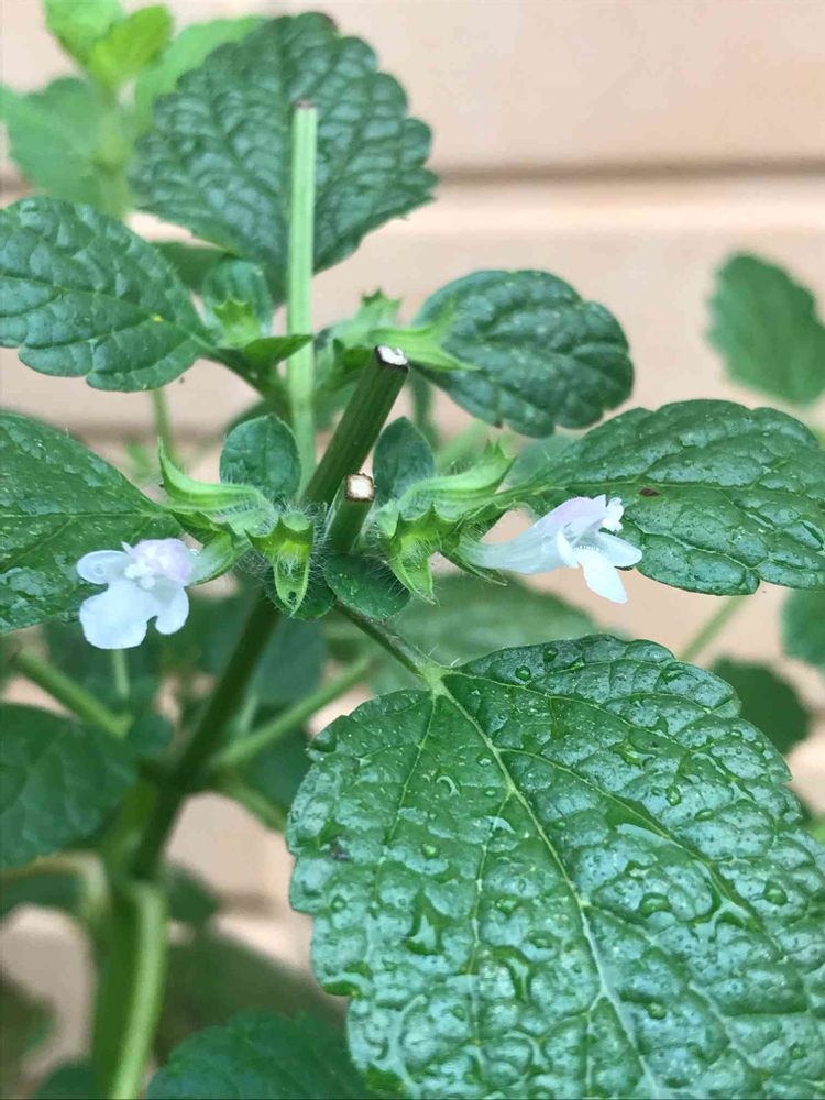 ...え〜,レモンバームの花です。見ての通りハーブティー利用の為、無残にもしょっちゅう刈られるので、花を見ることはありません。っていうかぼくもはじめてみました😅