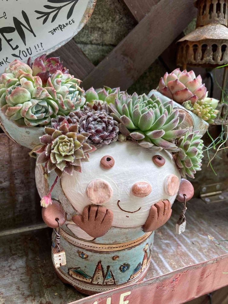 ちょうど、頭頂部がすっぽりと空いているので、ヘアスタイルを考えるように植物が植えられます。