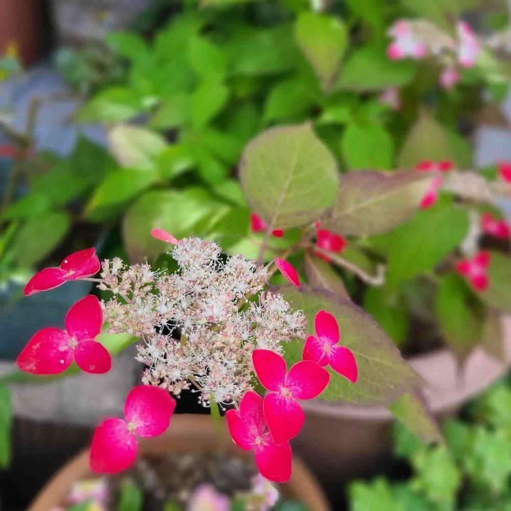 山アジサイ🌼🌱くれない🎵4.5年前に購入したのですが、やっとここまで成長してきました🙌真っ白の花弁が紅く色付いてきました😁