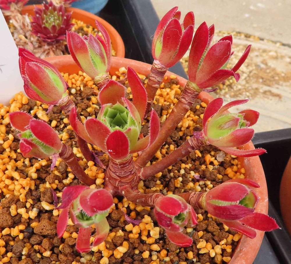 アエオニウムのトリビュートが次第にギュッと締まってきて夏の姿に近づいてきた。ただ,今年は外側の葉の色が鮮やかな赤色のまま。赤色で閉じた姿は今だけで夏には緑に戻ると思う。