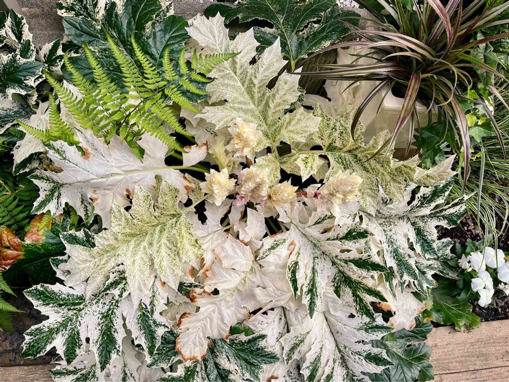 日陰で存在感抜群、パッと明るくなるアカンサスモリス。葉は高さは出ず横に広がる。花芽は白いが咲くとピンクがかる。