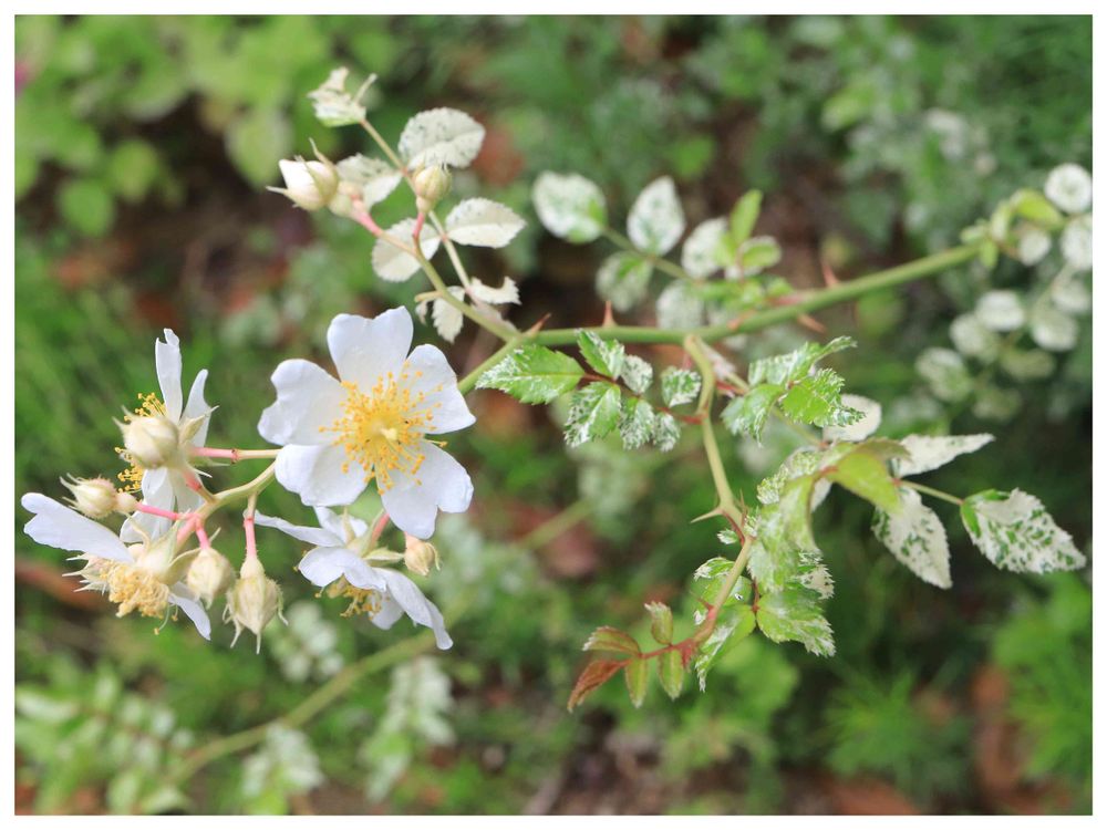 ウチではいちばん遅咲きの葉に美しい白い斑が入るテリハノイバラです( ⁎ᵕᴗᵕ⁎ )❤︎