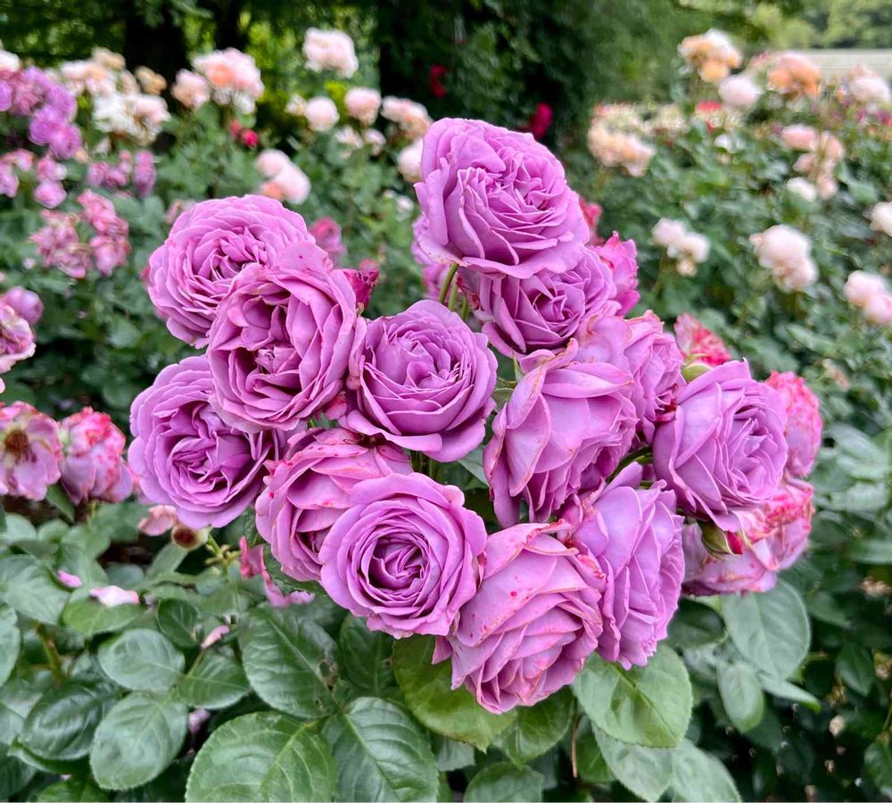 バラ・カインダブルー、紫の薔薇の圧巻の房咲きに魅了されました。伊奈町のバラ園にて。