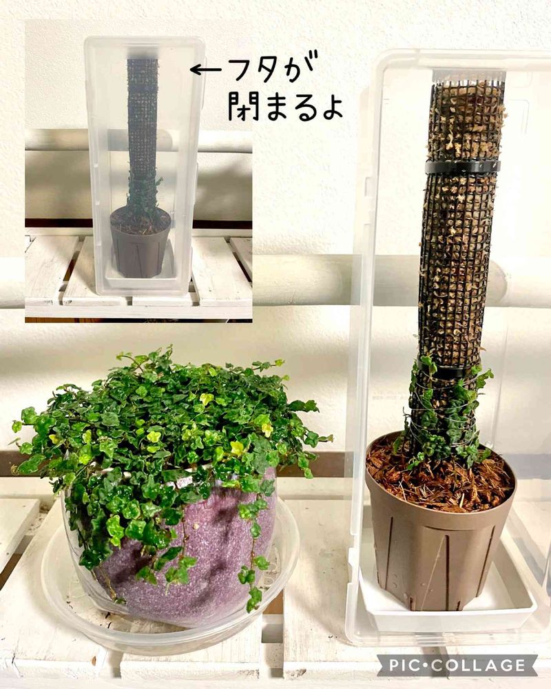 水苔を100均の鉢底ネットでくるんでプミラを100均のスリット鉢に植え100均の割り箸ケースにin😬