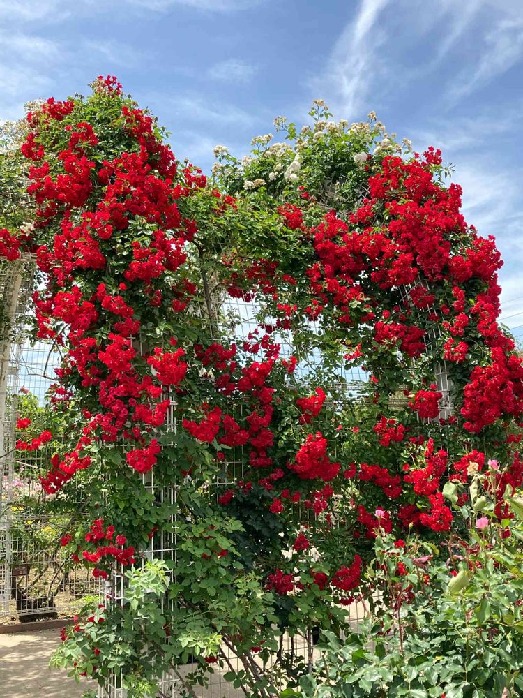 プリンセスミチコというバラは朱色系のオレンジ色と思いましたが、この赤いお花は、ツル・プリンセスミチコと言う、つるバラでした🌹