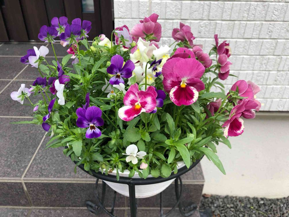 今日の玄関前担当🌼キョネンノパンジービオラと、何故か真ん中枯れてたんで金魚草植えたやつ
