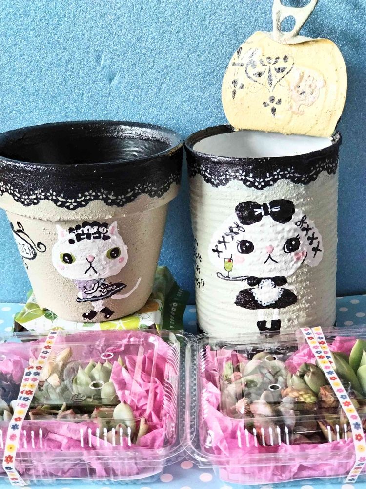 インスタのニッキーさんの所でgetしたぷりまみさんのゴスロリ猫ちゃんのリメ鉢&ゴスロリうさぎちゃんのリメ缶と多肉セットです🐱🐰